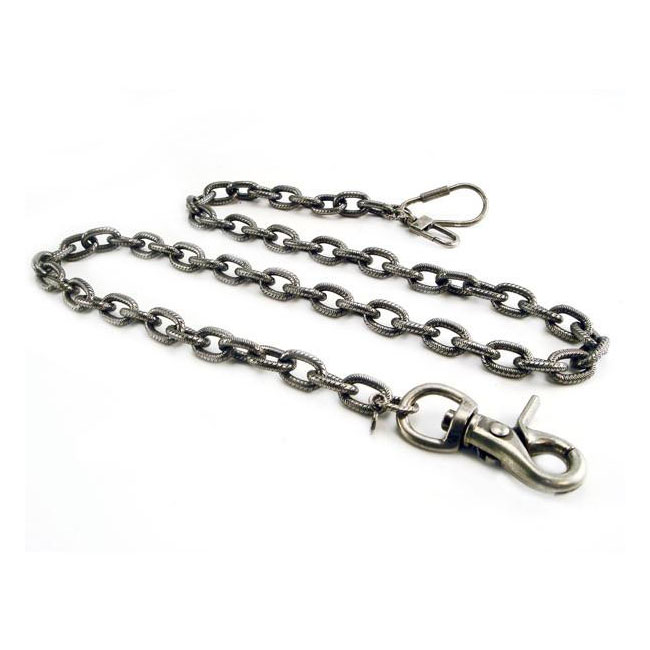Silver; heavyweight chain with textured links; steel with antique finish; chain links 3/4" length by 1/2" width; the sturdy snap hook and dual wallet hook end-pieces adds approximately 3" to the chain length